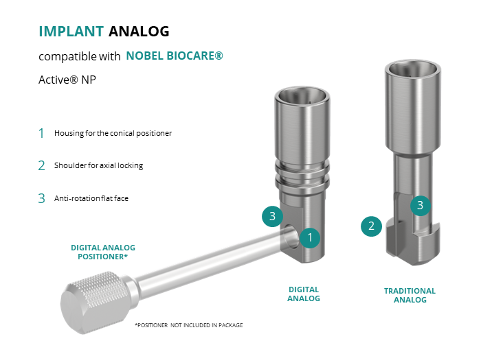 - Digital Analog: for models made of resin through 3D printing, locking is achieved using a slightly conical positioner, ensuring axial positioning.