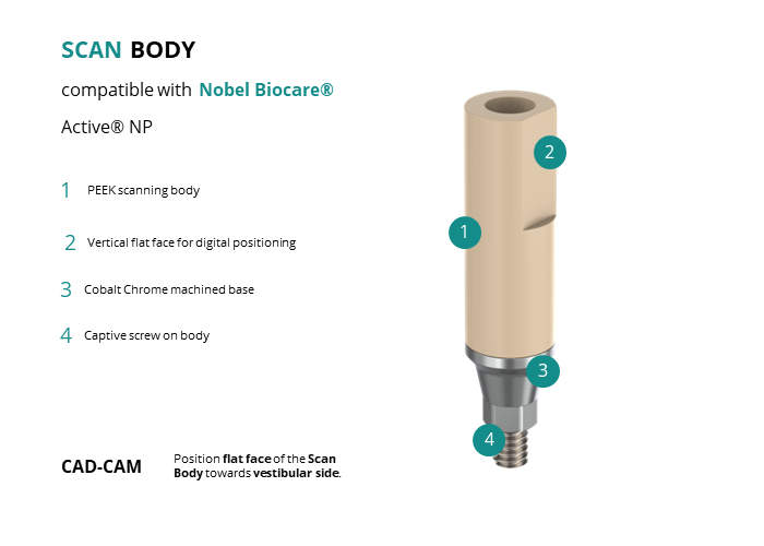 - CAD-CAM: Position flat face of the Scan Body towards vestibular side.
