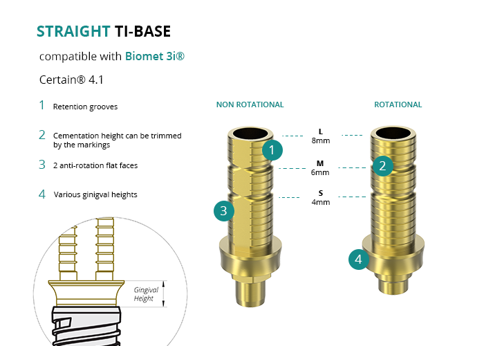 GT-Medical's Ti-Base are compatible with Certain® 4.1 implants from Biomet 3i®, allowing a stable and long-lasting connection between the implant and the prosthesis. They are made entirely of Titanium Grade 5 with a yellow anodized for a more aesthetic finish. They have a cementation trunk that can be cut to various heights, 2 flat faces to perform the anti-rotating function and a gingival body of various heights, depending on the type of connection.
