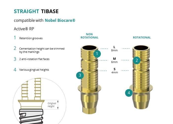 GT-Medical's Ti-Base are compatible with Active® RP implants from Nobel Biocare®, allowing a stable and long-lasting connection between the implant and the prosthesis. They are made entirely of Titanium Grade 5 with a yellow anodized for a more aesthetic finish. They have a cementation trunk that can be cut to various heights, 2 flat faces to perform the anti-rotating function and a gingival body of various heights, depending on the type of connection.