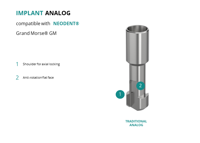 The GT-Medical analog compatible with the Neodent® Grand Morse® GM implant line is made of Stainless Steel, has a diameter of 3.5mm, and accurately replicates the connection of this Neodent® implant.