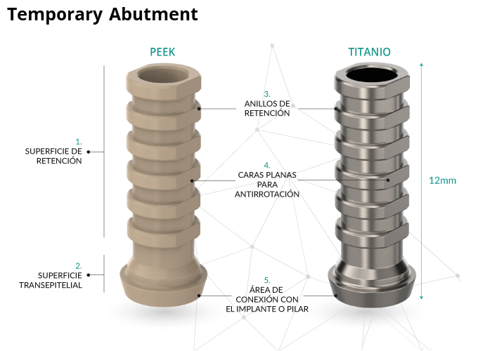 The contact surface with the prosthesis has very pronounced retention rings, as well as two flat faces that ensure anti-rotation.
