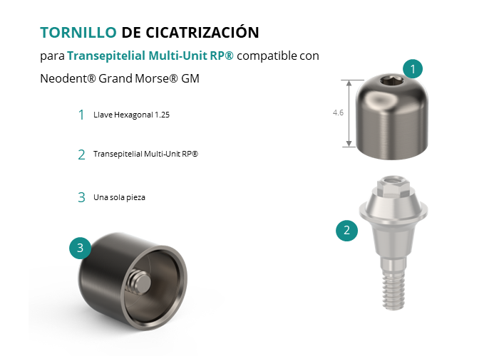 GT-Medical ofrece un Tornillo de Cicatrización para el Transepitelial Multi-Unit® RP (tipo Nobel®) compatible con la línea de implantes Grand Morse® GM de la marca Neodent®, está fabricado en Titanio Grado 5, tiene un diámetro de 4.8mm, y una altura total de 4.6mm.