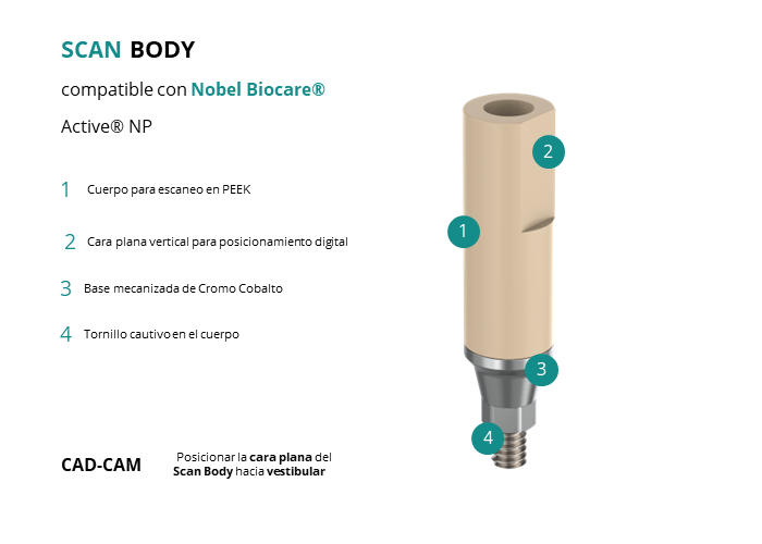 El Scan Body de GT-Medical es compatible con los implantes Active® NP de Nobel Biocare®, permitiendo una digitalización precisa de la posición del implante dental para su posterior diseño en un software CAD Dental. Está compuesto por un cuerpo de escaneo de PEEK, una base mecanizada de CrCo y un tornillo de Titanio Grado 5. Esta base mecanizada garantiza un ajuste óptimo con el implante, mientras que su naturaleza metálica radiopaca facilita la visualización en radiografías, asegurando así un posicionamiento correcto del scan body. Ideal para flujos intraorales y extraorales. Consulte las librerías disponibles para exocad y 3shape en el apartado de librerías relacionadas del producto.