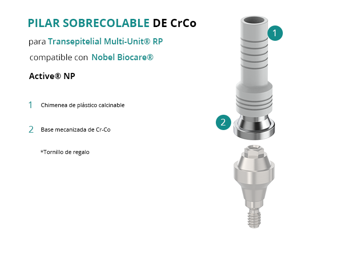 Pilar Sobrecolable de CrCo para Transepitelial Multi-Unit® RP compatible con Nobel Biocare® Active® NP