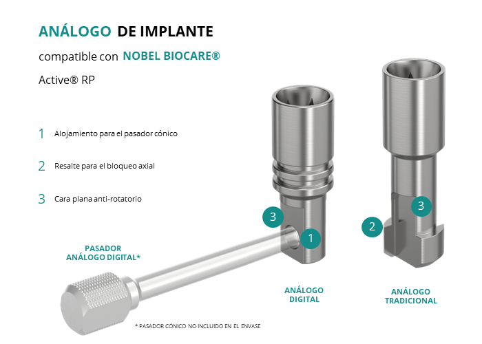 - Análogo digital: para modelos fabricados en resina por impresión 3D, el bloqueo se realiza mediante un pasador ligeramente cónico, que asegura el posicionado axial.