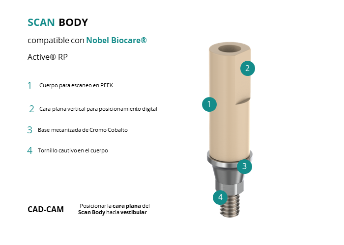 - CAD-CAM: Posicionar la cara plana del Scan Body hacia vestibular.