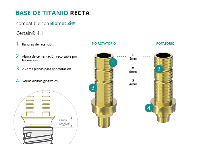 Las Ti-Base Rectas de GT-Medical son compatibles con los implantes Certain® 4.1 de Biomet 3i®, permitiendo una conexión estable y duradera entre el implante y la prótesis. Están compuestas en su totalidad por Titanio de Grado 5 con un anodizado dorado para un acabado más estético. Poseen un tronco de cementación recortable a varias alturas, 2 caras planas para realizar la función antirotativa y un cuerpo gingival de varias alturas, dependiendo del tipo de conexión.