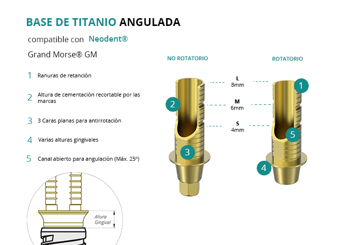 Las Ti-Base Anguladas de GT-Medical son compatibles con los implantes Grand Morse® GM de Neodent®, facilitando una conexión estable y duradera entre el implante y la prótesis, y permitiendo corregir angulaciones de hasta 25 grados. Están compuestas en su totalidad por Titanio de Grado 5 con un anodizado dorado para un acabado más estético. Poseen un tronco de cementación recortable a varias alturas con canal abierto para permitir angulación, 3 caras planas para realizar la función antirotativa y un cuerpo gingival de varias alturas, dependiendo del tipo de conexión.