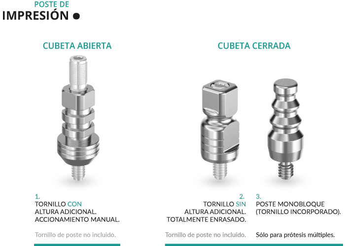 El cuerpo del poste de impresión, tiene una forma retentiva de 12 mm de altura. Está provisto de varias caras planas verticales para el correcto posicionado angular y de una cara plana horizontal para el correcto posicionado en altura.