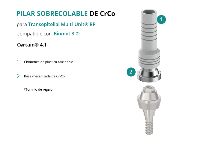 Pilar Sobrecolable de CrCo para Transepitelial Multi-Unit® RP compatible con Biomet 3i® Certain® 4.1