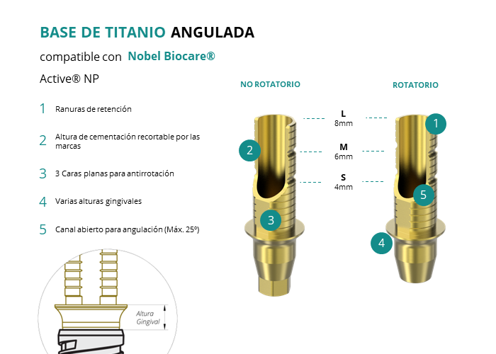 Las Ti-Base Anguladas de GT-Medical son compatibles con los implantes Active® NP de Nobel Biocare®, facilitando una conexión estable y duradera entre el implante y la prótesis, y permitiendo corregir angulaciones de hasta 25 grados. Están compuestas en su totalidad por Titanio de Grado 5 con un anodizado dorado para un acabado más estético. Poseen un tronco de cementación recortable a varias alturas con canal abierto para permitir angulación, 3 caras planas para realizar la función antirotativa y un cuerpo gingival de varias alturas, dependiendo del tipo de conexión.