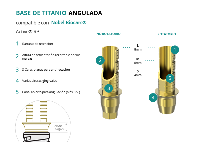 Las Ti-Base Anguladas de GT-Medical son compatibles con los implantes Active® RP de Nobel Biocare®, facilitando una conexión estable y duradera entre el implante y la prótesis, y permitiendo corregir angulaciones de hasta 25 grados. Están compuestas en su totalidad por Titanio de Grado 5 con un anodizado dorado para un acabado más estético. Poseen un tronco de cementación recortable a varias alturas con canal abierto para permitir angulación, 3 caras planas para realizar la función antirotativa y un cuerpo gingival de varias alturas, dependiendo del tipo de conexión.