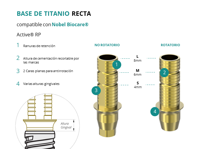 Las Ti-Base Rectas de GT-Medical son compatibles con los implantes Active® RP de Nobel Biocare®, permitiendo una conexión estable y duradera entre el implante y la prótesis. Están compuestas en su totalidad por Titanio de Grado 5 con un anodizado dorado para un acabado más estético. Poseen un tronco de cementación recortable a varias alturas, 2 caras planas para realizar la función antirotativa y un cuerpo gingival de varias alturas, dependiendo del tipo de conexión.