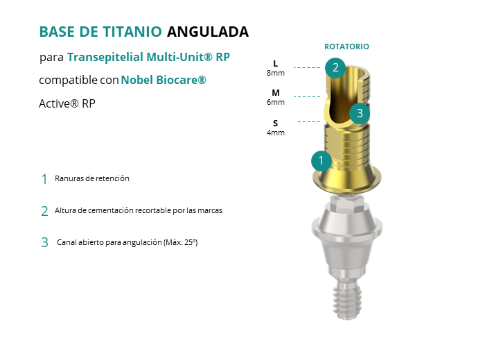 Las Ti-Base Anguladas de GT-Medical son compatibles con los implantes Active® RP de Nobel Biocare®, lo que asegura una conexión estable y duradera entre el Transepitelial Multi-Unit® RP y la prótesis, permitiendo además corregir angulaciones de hasta 25 grados. Están compuestas en su totalidad por Titanio de Grado 5 con un anodizado dorado para un acabado más estético. Poseen un tronco de cementación ranurado y recortable a varias alturas.