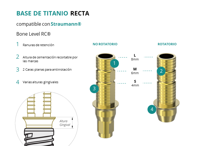 Las Ti-Base Rectas de GT-Medical son compatibles con los implantes Bone Level RC® de Straumann®, permitiendo una conexión estable y duradera entre el implante y la prótesis. Están compuestas en su totalidad por Titanio de Grado 5 con un anodizado dorado para un acabado más estético. Poseen un tronco de cementación recortable a varias alturas, 2 caras planas para realizar la función antirotativa y un cuerpo gingival de varias alturas, dependiendo del tipo de conexión.
