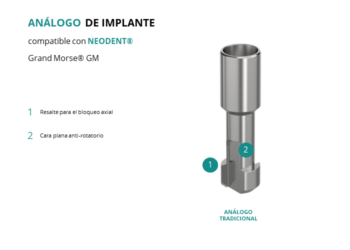 El análogo de GT-Medical compatible con la línea de implantes Grand Morse® GM de la marca Neodent®, está fabricado en Acero Inoxidable, tiene un diámetro de 3.5mm, y replica con exactitud la conexión de este implante de Neodent®.