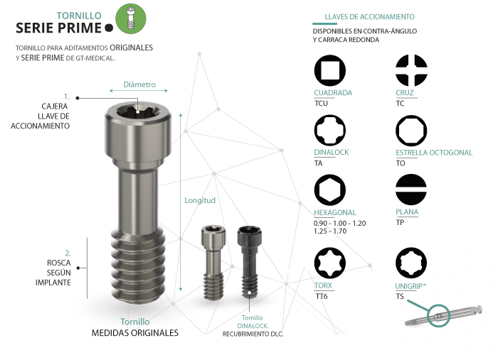 La superficie de conexión del Tornillo Serie Prime con el pilar, ha sido diseñada rigurosamente con las medidas originales del tornillo del implante correspondiente. La cajera de la llave de accionamiento puede tener formas distintas dependiendo del sistema de implante donde vayan alojados los tornillos.