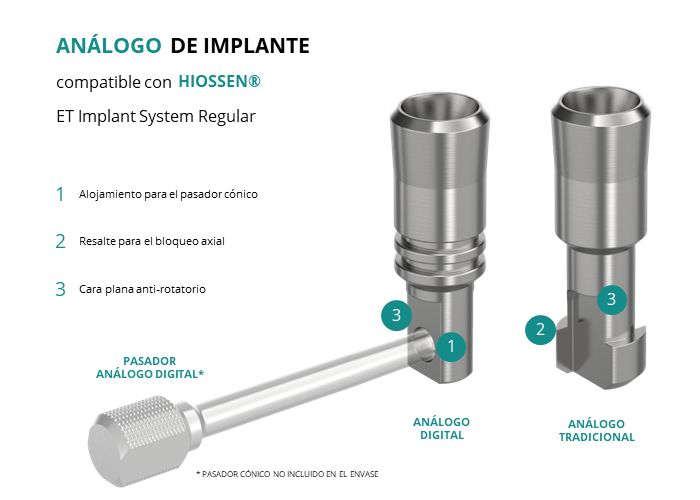 El análogo de GT-Medical compatible con la línea de implantes ET Implant System Regular de la marca Hiossen®, está fabricado en Acero Inoxidable, tiene un diámetro de 4.0mm, y replica con exactitud la conexión de este implante de Hiossen®.