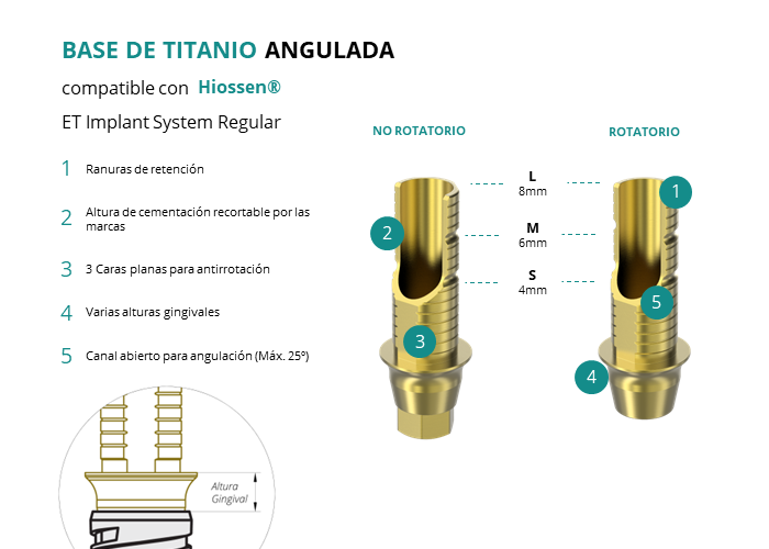 Las Ti-Base Anguladas de GT-Medical son compatibles con los implantes ET Implant System Regular de Hiossen®, facilitando una conexión estable y duradera entre el implante y la prótesis, y permitiendo corregir angulaciones de hasta 25 grados. Están compuestas en su totalidad por Titanio de Grado 5 con un anodizado dorado para un acabado más estético. Poseen un tronco de cementación recortable a varias alturas con canal abierto para permitir angulación, 3 caras planas para realizar la función antirotativa y un cuerpo gingival de varias alturas, dependiendo del tipo de conexión.