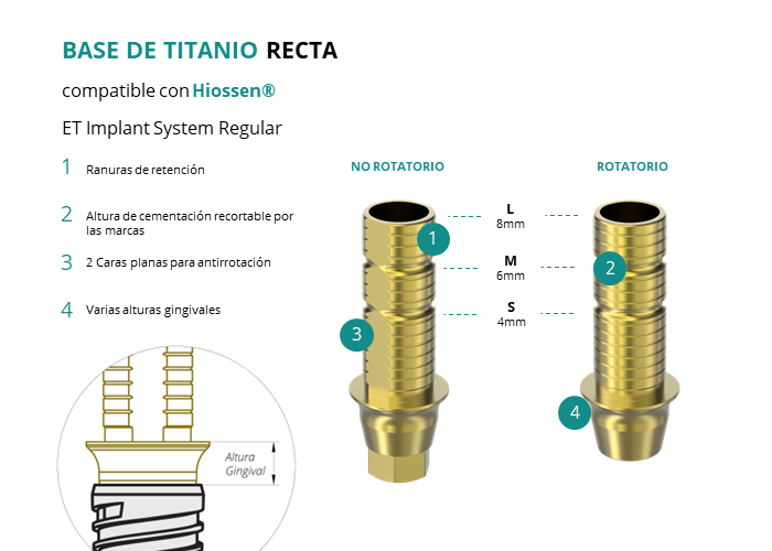 Las Ti-Base Rectas de GT-Medical son compatibles con los implantes ET Implant System Regular de Hiossen®, permitiendo una conexión estable y duradera entre el implante y la prótesis. Están compuestas en su totalidad por Titanio de Grado 5 con un anodizado dorado para un acabado más estético. Poseen un tronco de cementación recortable a varias alturas, 2 caras planas para realizar la función antirotativa y un cuerpo gingival de varias alturas, dependiendo del tipo de conexión.